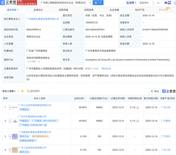 企查查APP显示,近日,广州祺工智联股权投资合伙企业(有限合伙)成立,出资额10亿元,经营范围包含:以自有资金从事投资活动;以私募基金从事股权投资、投资管理、资产管理等活动。企查查股权穿透显示,该企业由广汽集团(601238)等共同出资。