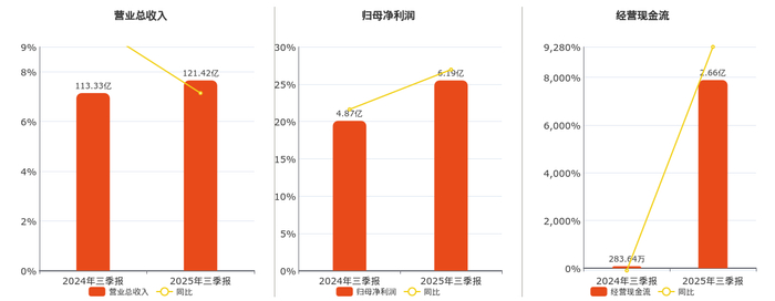 公司营业总收入为121.42亿元。归母净利润为6.19亿元。经营活动现金净流入为2.66亿元。