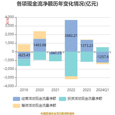 2024年第一季度,公司经营活动现金流净额为-1257.60亿元,同比减少2587.37亿元,主要系吸收存款产生的现金流入减少所致;筹资活动现金流净额-179.28亿元,同比减少387.84亿元;投资活动现金流净额528.81亿元,上年同期为-1016.97亿元。