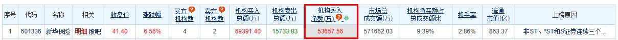 新华保险龙虎榜:三个交易日机构净买入5.37亿元