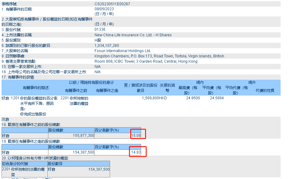 复星国际减持新华保险H股158.98万股股份,持股比降至14.93%