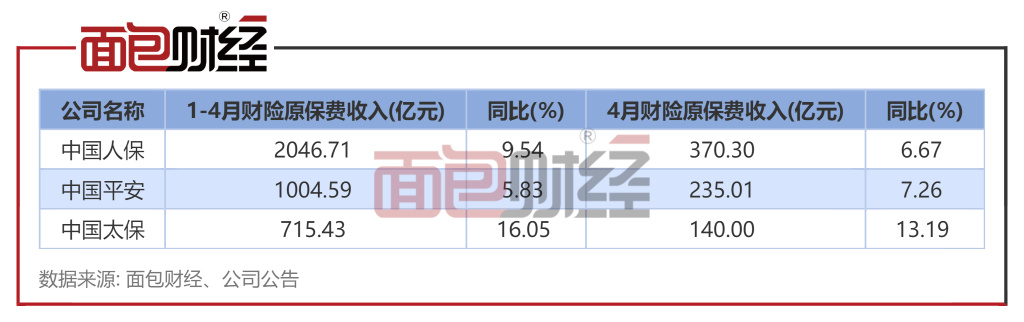 增速方面,4月份,三家机构同比增速均超6%。其中,中国太保财险原保费收入同比增速达到13.19%,排名第一。
