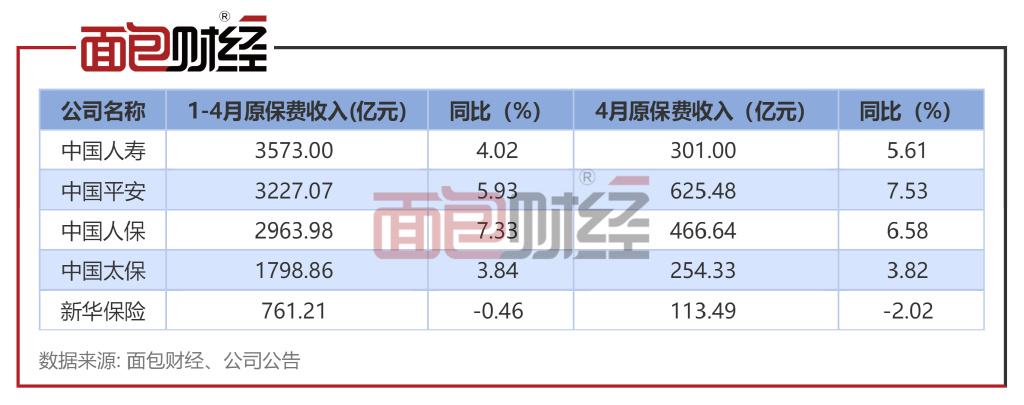 五大险企4月原保费透视:仅新华保险同比下滑