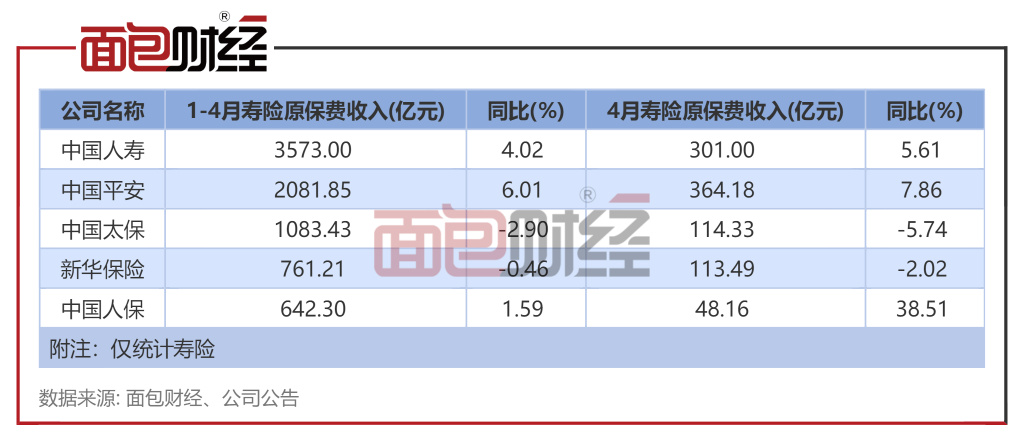 寿险前4月原保费:平安、人寿增速较快,太保降幅最大