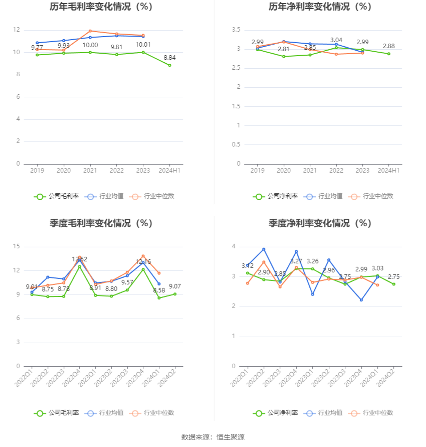 2024年上半年,公司毛利率为8.84%,同比下降0.01个百分点;净利率为2.88%,较上年同期下降0.22个百分点。从单季度指标来看,2024年第二季度公司毛利率为9.07%,同比上升0.27个百分点,环比上升0.49个百分点;净利率为2.75%,较上年同期下降0.21个百分点,较上一季度下降0.28个百分点。