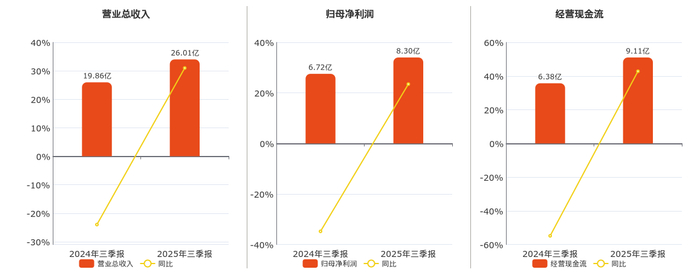 公司营业总收入为26.01亿元,较去年同报告期营业总收入增加6.15亿元,同比较去年同期上涨30.98%。归母净利润为8.30亿元,较去年同报告期归母净利润增加1.58亿元,同比较去年同期上涨23.46%。经营活动现金净流入为9.11亿元,较去年同报告期经营活动现金净流入增加2.73亿元,同比较去年同期上涨42.83%。