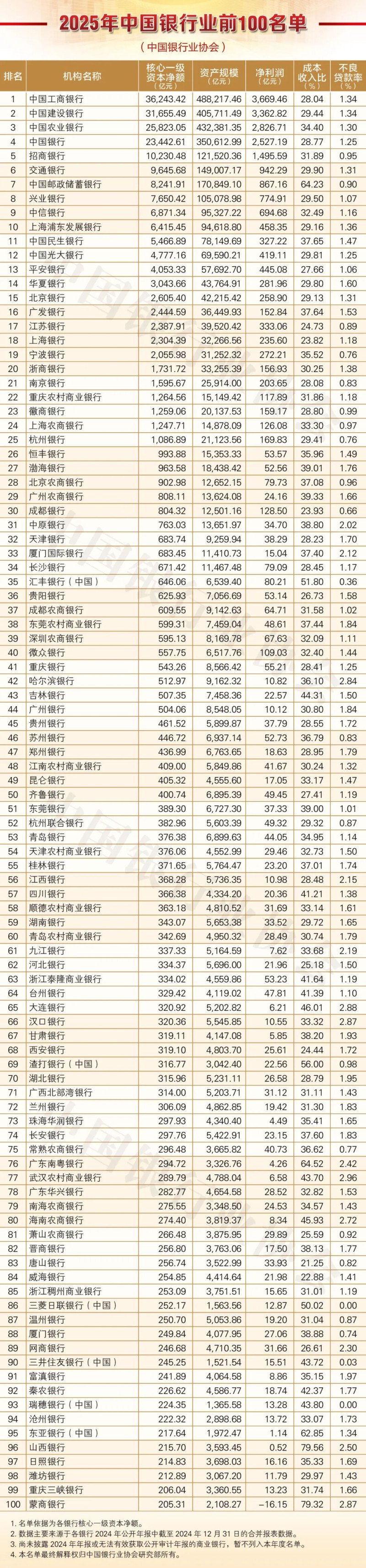 长沙晚报掌上长沙9月30日讯(全媒体记者 陈星源) 银行业江湖,谁是佼佼者?近日,中国银行业协会发布“2025年中国银行业前100名单”,该榜单按照核心一级资本净额对商业银行进行排序,对前100家银行的经营规模、盈利能力、运营效率和资产质量等进行综合评估。