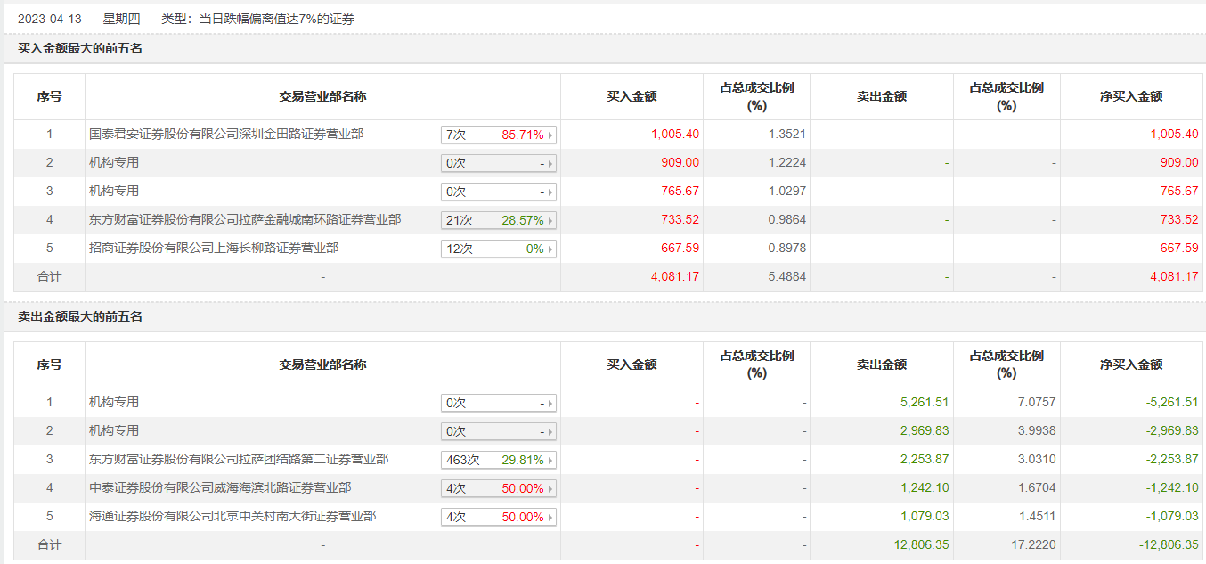 具体来看,机构买入1674.67万元,卖出8231.35万元,合计净卖出6556.68万元。此外,东方财富证券拉萨团结路第二证券营业部、中泰证券威海海滨北路证券营业部分别卖出2253.87万元、1242.10万元;国泰君安证券深圳金田路证券营业部、东方财富证券拉萨金融城南环路证券营业部分别买入1005.40万元、733.52万元。