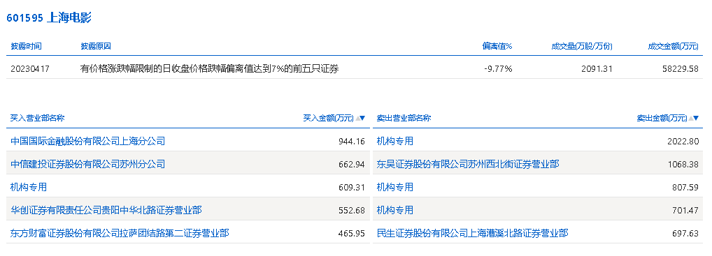 4月17日,上海电影今日跌8.34%,龙虎榜数据显示,上榜营业部席位全天成交8532.92万元,占当日总成交金额比例为14.65%。其中,买入金额为3235.05万元,卖出金额为5297.87万元,合计净卖出2062.82万元。