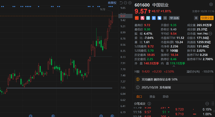 A股异动丨Q3业绩强劲,中国铝业A股连涨6日,AH股均刷新阶段新高