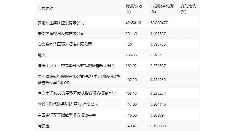 半年报显示,2024年上半年末公司十大流通股东中,新进股东为中国建设银行股份有限公司-鹏华中证国防指数型证券投资基金(LOF)、冯新玉,取代了一季度末的富国中证军工龙头交易型开放式指数证券投资基金、李红杰。在具体持股比例上,国泰中证军工交易型开放式指数证券投资基金、南方中证1000交易型开放式指数证券投资基金持股有所上升,富国中证军工指数型证券投资基金持股有所下降。