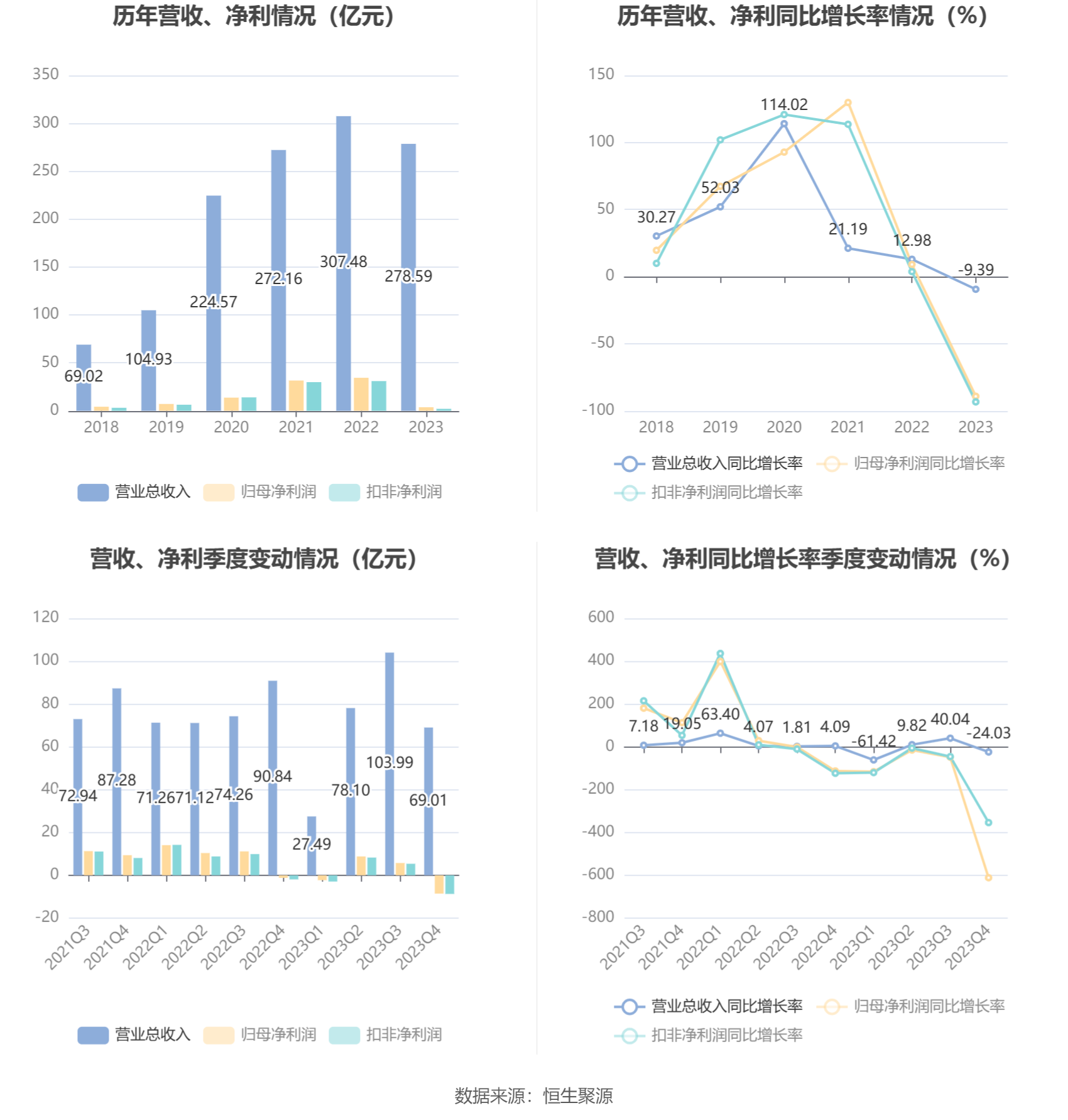 2023年,公司毛利率为11.20%,同比下降8.79个百分点;净利率为1.36%,较上年同期下降9.83个百分点。从单季度指标来看,2023年第四季度公司毛利率为-2.73%,同比下降15.03个百分点,环比下降15.90个百分点;净利率为-12.82%,较上年同期下降11.55个百分点,较上一季度下降18.66个百分点。