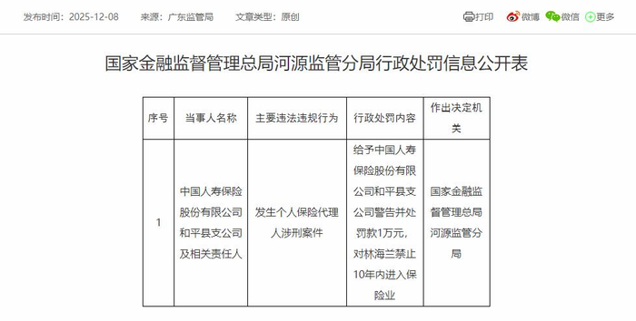 国家金融监督管理总局河源监管分局给予中国人寿保险股份有限公司和平县支公司警告并处罚款1万元,对林海兰禁止10年内进入保险业。