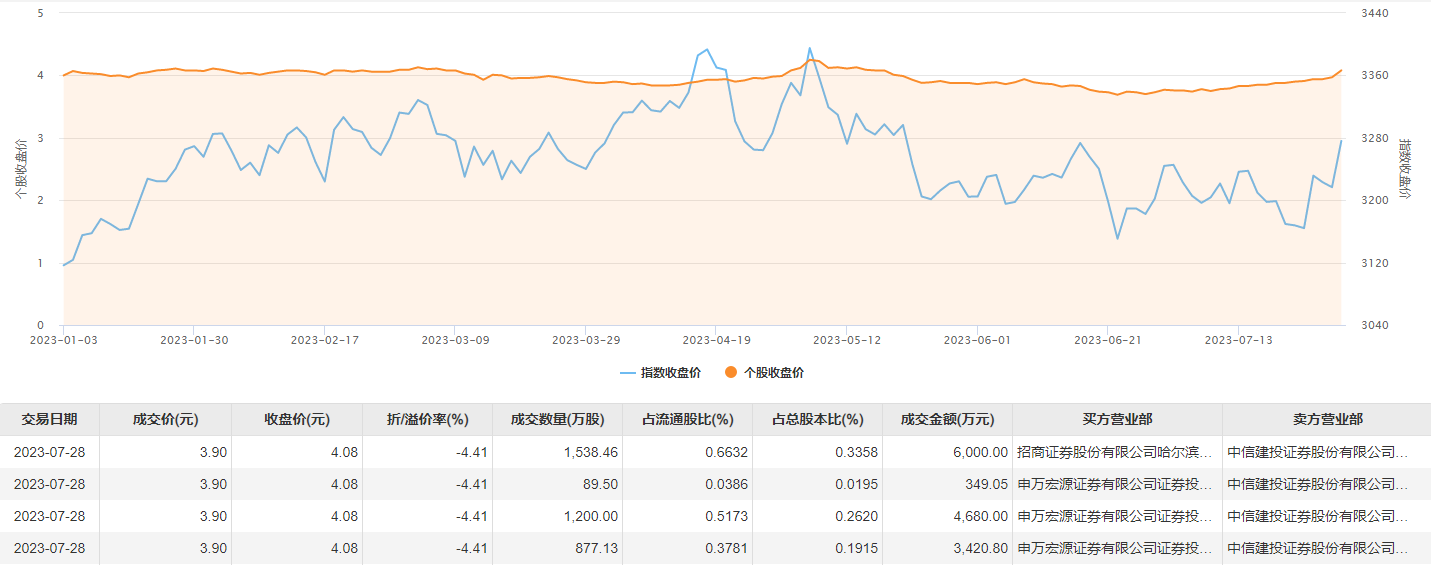 7月28日大宗交易成交3705.09万股,成交额1.44亿元,占当日总成交额的46.35%,成交价3.9元,较市场收盘价4.08元折价4.41%。