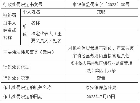 国家金融监督管理总局网站同日披露的泰银保监罚决字〔2023〕30号显示,范鹏对机构信贷管理不到位,严重违反审慎经营规则负直接管理责任。泰安银保监分局依据《中华人民共和国银行业监督管理法》第四十八条,对范鹏警告。