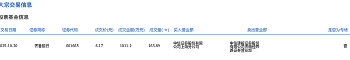 齐鲁银行今日大宗交易平价成交163.89万股,成交额1011.2万元