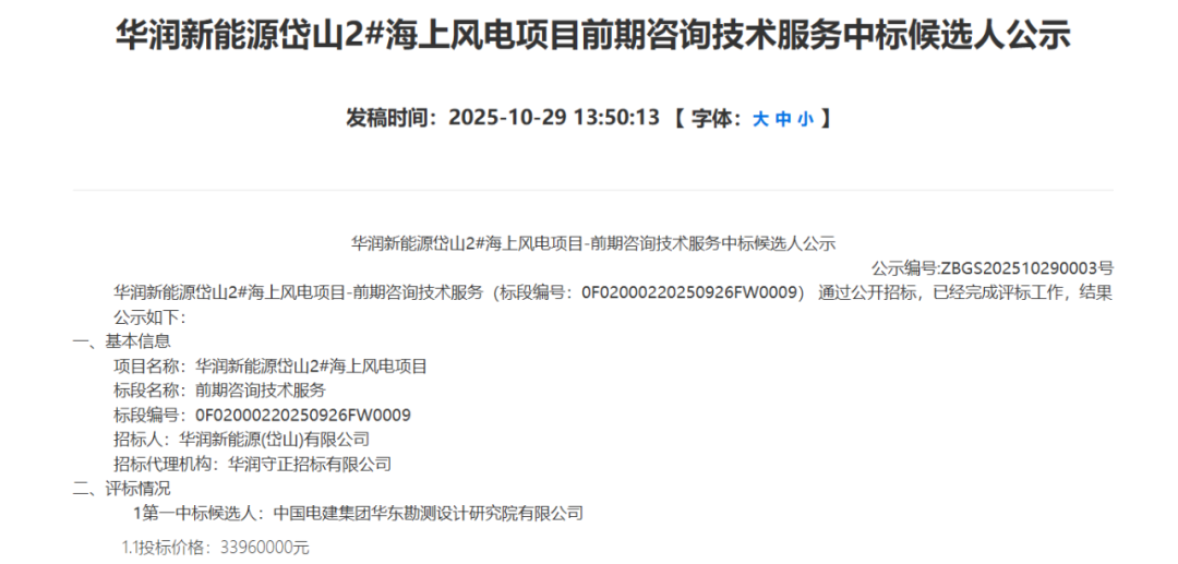 10月29日,华润集团守正采购交易平台发布《华润新能源岱山2#海上风电项目前期咨询技术服务中标候选人公示》的公告。