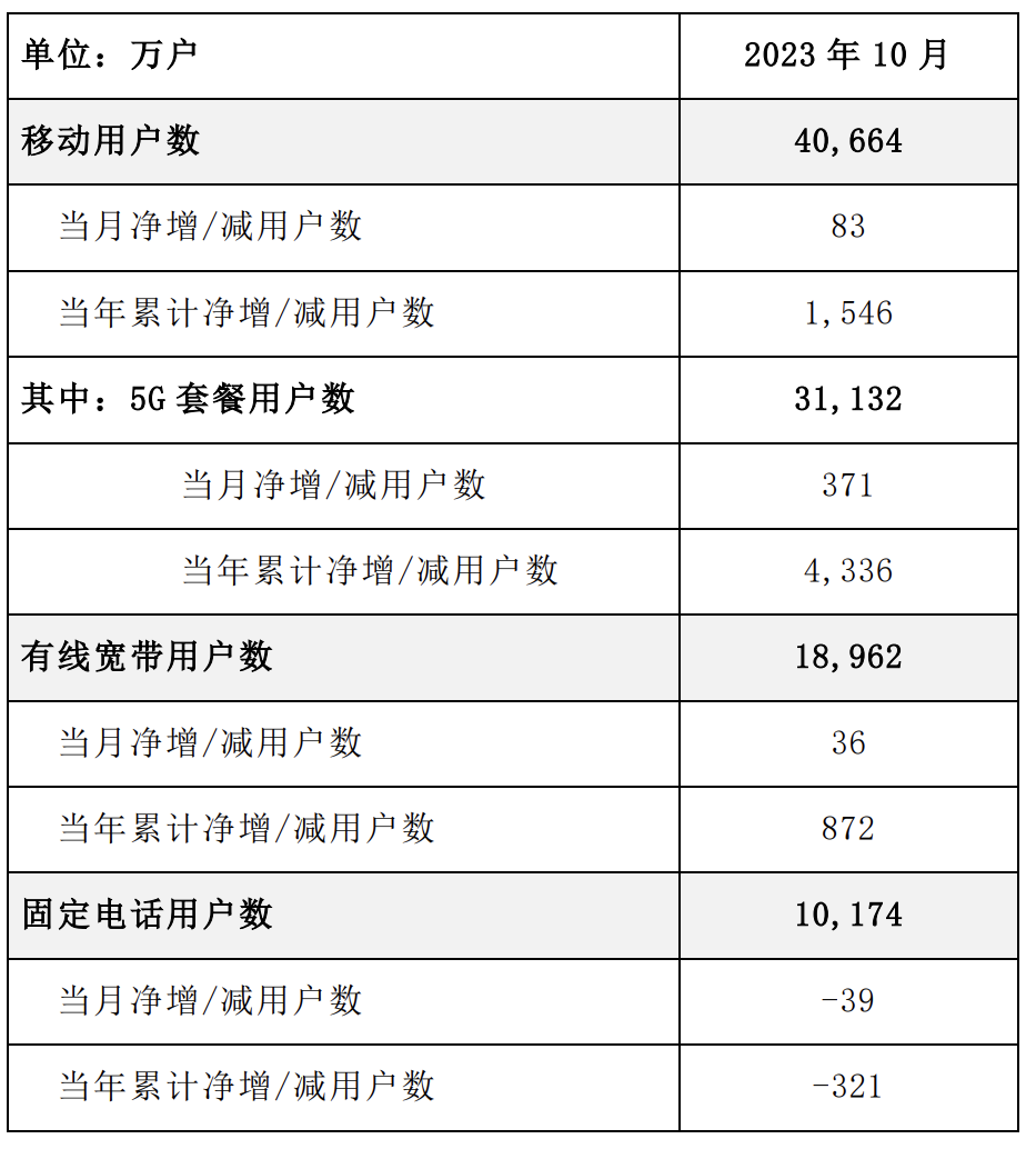 11月20日公告,10月移动用户数40664万户,当月净增用户数83万户。其中,5G套餐用户数31132万户,当月净增371万户。