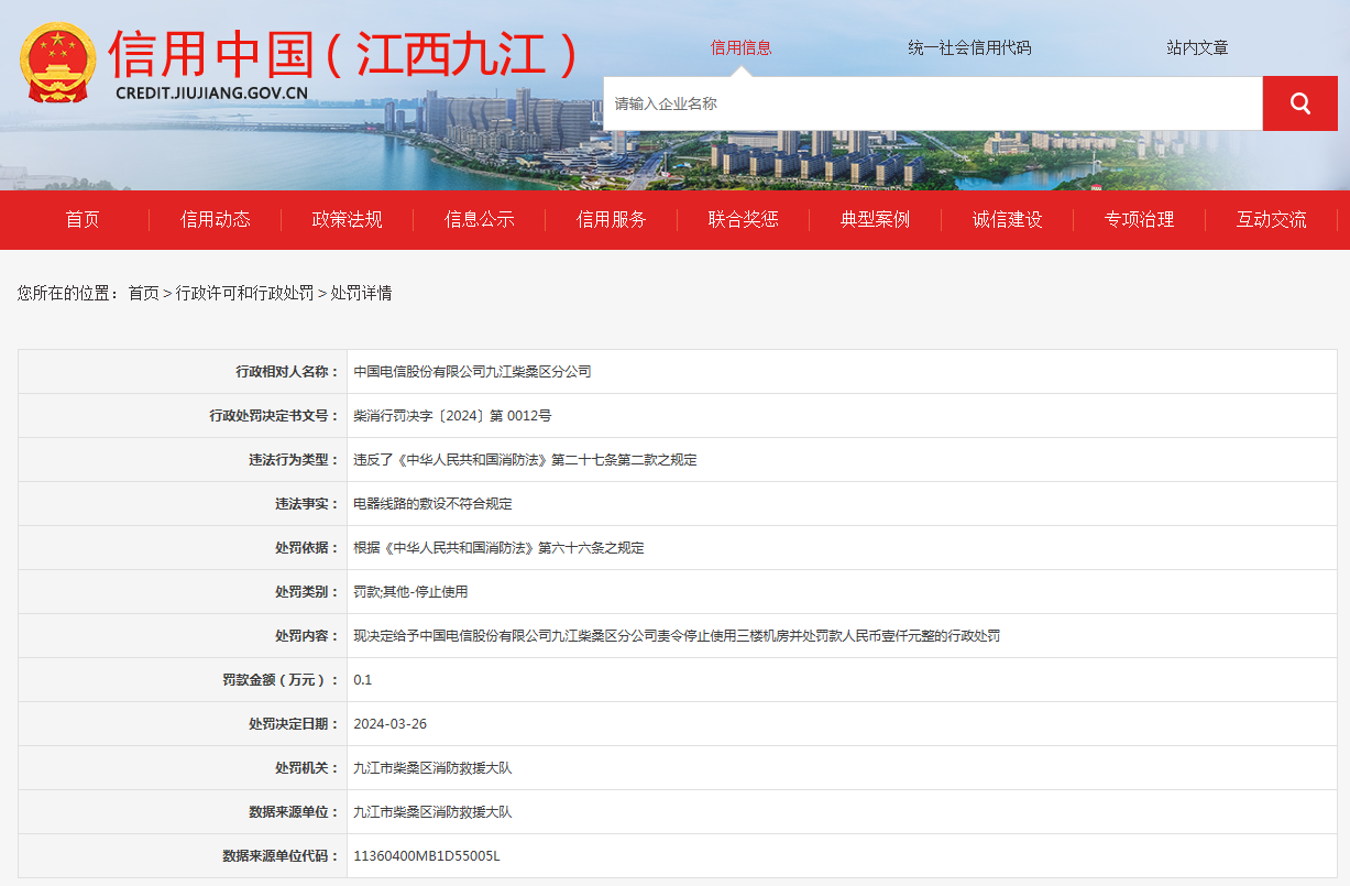 关于对中国电信股份有限公司九江柴桑区分公司行政处罚信息公示