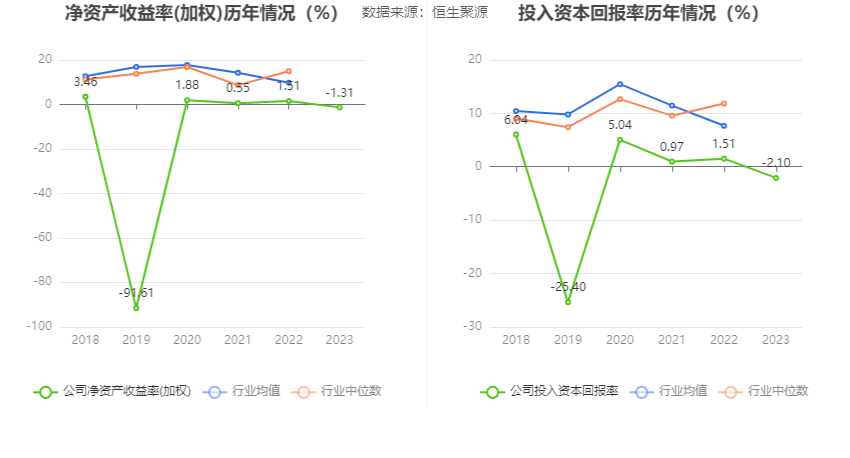 数据显示,2023年公司加权平均净资产收益率为-1.31%,较上年同期下降2.82个百分点;公司2023年投入资本回报率为-2.10%,较上年同期下降3.61个百分点。