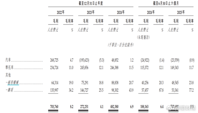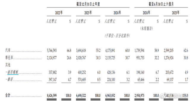从收入结构看,千里科技仍是一家以汽车和摩托车销售为主的传统制造商。2022年至2025年上半年,汽车销售占收入比重在55%至70%之间波动,摩托车销售占比则稳定在24%至31%之间。两大传统业务合计贡献约九成的营收,构成了其当前生存的基本盘。
