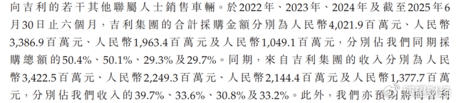 吉利生态是千里科技最核心的资产与最大的依赖。据招股书显示,吉利集团常年同时位列千里科技的第一大客户和第一大供应商,2022年至2025年上半年,来自吉利的采购与销售占比均保持在29%至51%的高位区间。