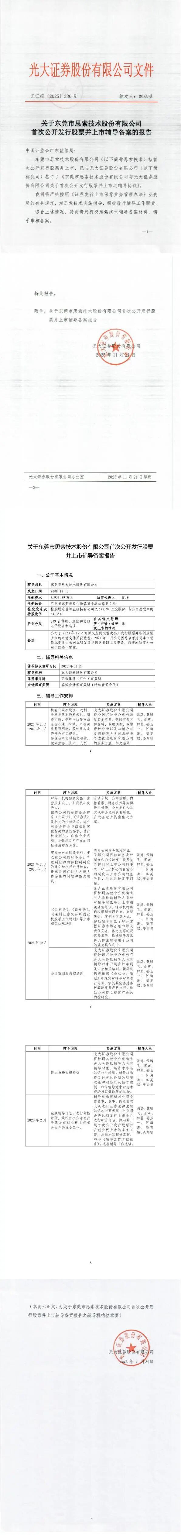 2025年11月28日,证监会官网显示,光大证券已提交《关于东莞市思索技术股份有限公司首次公开发行股票并上市辅导备案的报告》,落款日期为11月21日。目前,思索技术的辅导状态为“辅导备案”。辅导机构为光大证券股份有限公司,律师事务所为国浩律师(广州)事务所,会计师事务所为容诚会计师事务所(特殊普通合伙)。