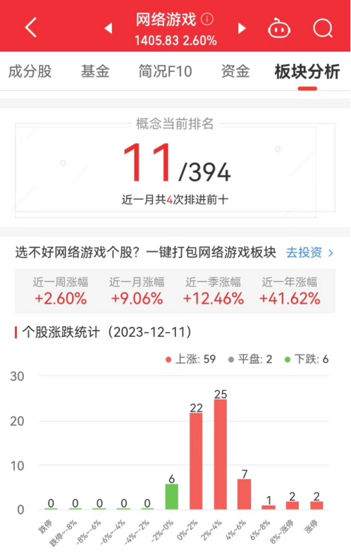 中国经济网北京12月11日讯今日,网络游戏板块整体涨幅2.6%,其中,59只股票上涨,2只股票平盘,6只股票下跌。