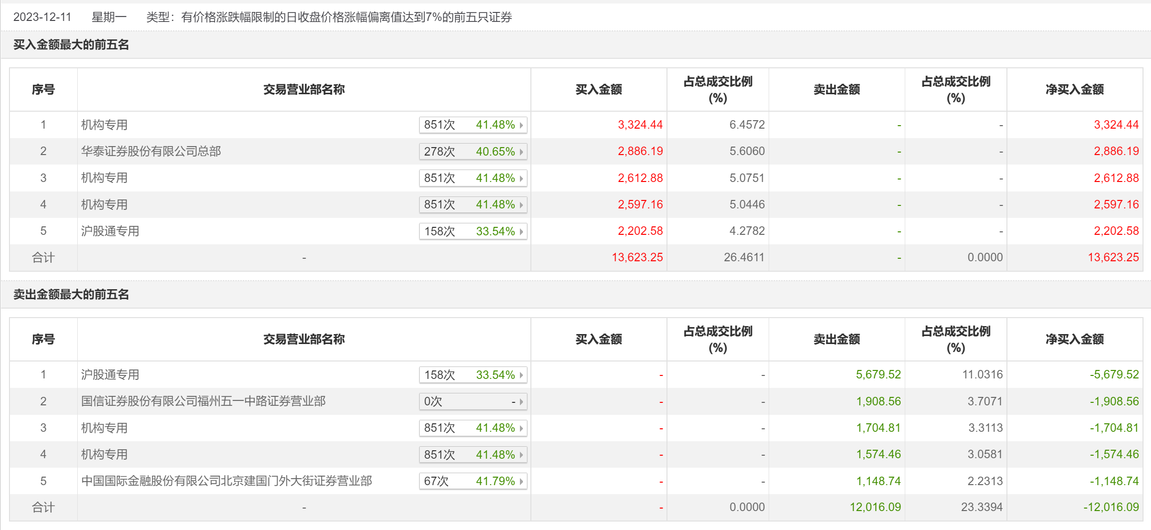 12月11日,皖新传媒今日涨停,全天换手率达3.24%,振幅达9.91%。龙虎榜数据显示,营业部席位合计净买入1607.16万元。其中,机构买入8534.47万元,卖出3279.27万元,合计净买入5255.21万元。此外,华泰证券总部、沪股通专用分别买入2886.19万元、2202.58万元;沪股通专用、国信证券福州五一中路证券营业部分别卖出5679.52万元、1908.56万元。