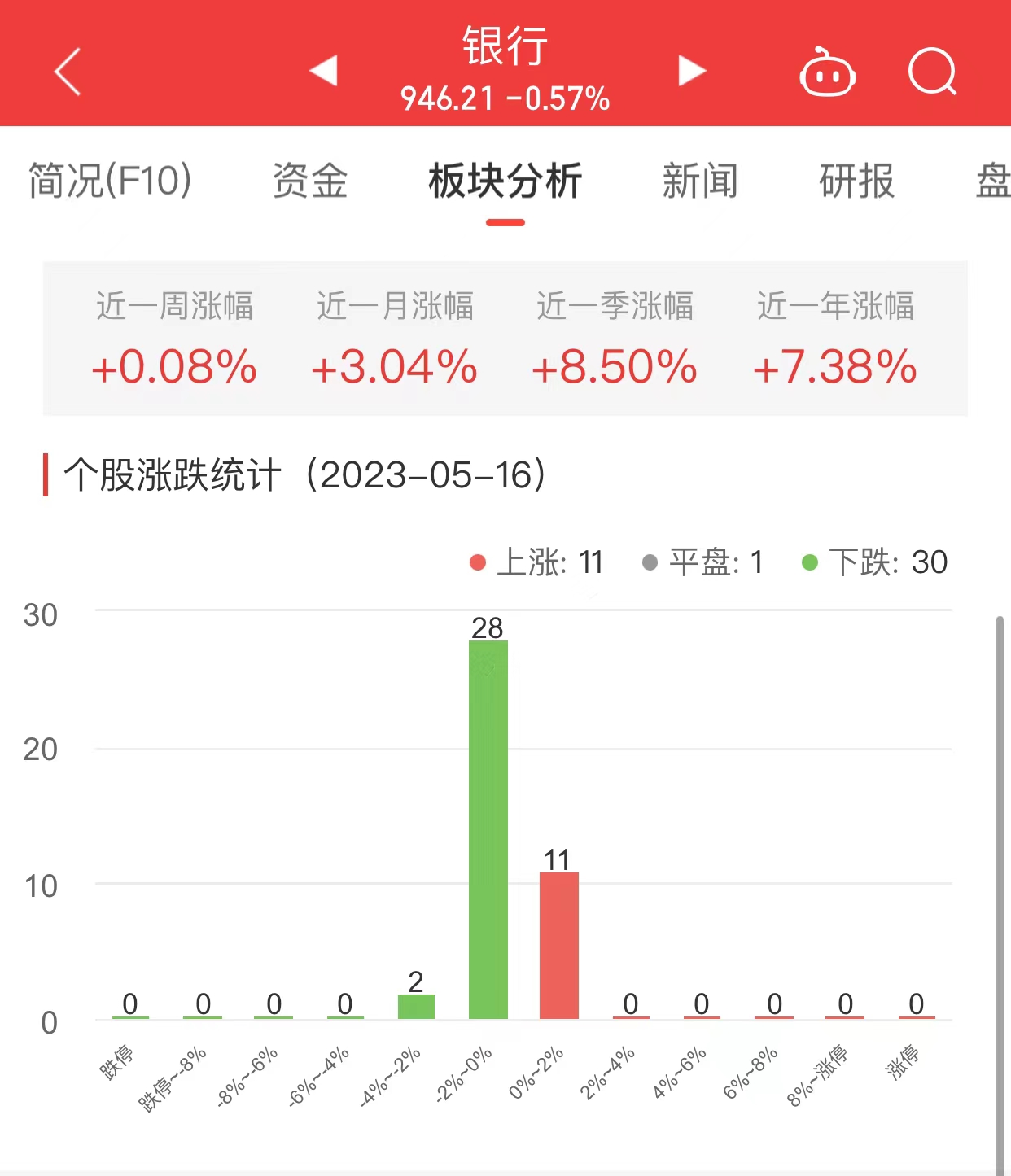 数据显示,截至今日,银行板块近一周涨幅0.08%,近一月涨幅3.04%,近一季涨幅8.50%。
