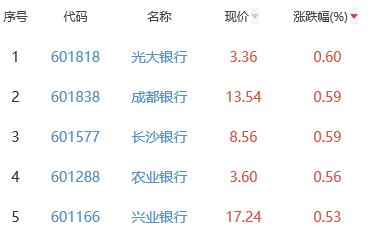 其中,光大银行、成都银行、长沙银行、农业银行、兴业银行位列板块涨幅前五位,涨幅分别为0.60%、0.59%、0.59%、0.56%、0.53%。