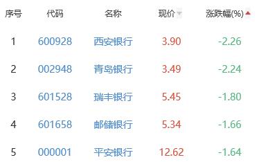 西安银行、青岛银行、瑞丰银行、邮储银行、平安银行位列涨幅榜后五位,涨幅分别为-2.26%、-2.24%、-1.80%、-1.66%、-1.64%。