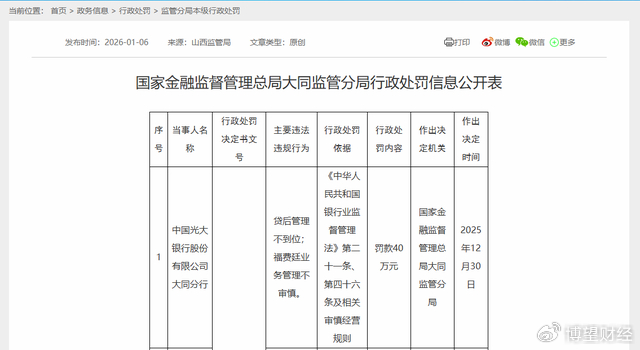 2026年1月6日,国家金融监督管理总局大同监管分局行政处罚信息公开表(同金管罚决字〔2025〕45号)显示,中国光大银行股份有限公司大同分行,因“贷后管理不到位;福费廷业务管理不审慎”,国家金融监督管理总局大同监管分局于2025年12月30日对其作出罚款40万元的行政处罚。