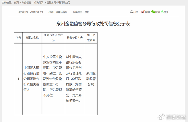 同一天,泉州金融监管分局行政处罚信息公示表显示,中国光大银行股份有限公司泉州分行及相关责任人,因“个人经营性贷款贷前调查不尽职、贷后管理不到位;流动资金贷款贷前调查不尽职、贷后管理不到位”,泉州金融监管分局对中国光大银行股份有限公司泉州分行合计处以120万元罚款,对蔡某某给予警告,对吴某给予警告。