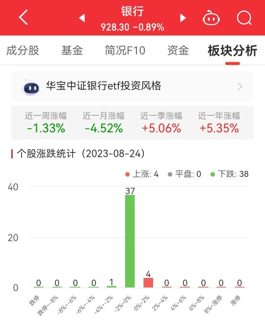 中国经济网北京8月24日讯今日,银行板块整体跌幅0.89%,其中4只股票上涨,38只股票下跌。