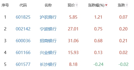 其中,沪农商行、宁波银行、招商银行、兴业银行、长沙银行位列板块涨幅前五位,涨幅分别为1.21%、0.75%、0.68%、0.13%、-0.24%。