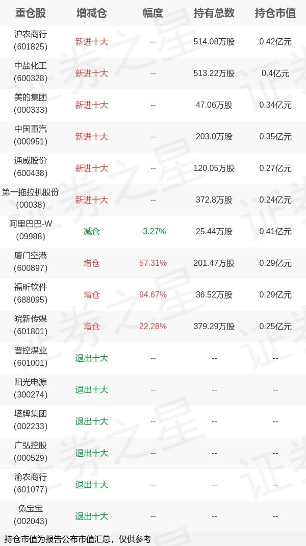 证券之星消息,10月23日中欧基金旗下邓达管理的中欧盈选稳健6个月持有期混合型发起式基金中基金(FOF)公布三季报。与上一季度相比,该基金前十大重仓股新增沪农商行,中盐化工,美的集团,中国重汽,通威股份,第一拖拉机股份;其中沪农商行持仓占比0.39%,为该基金第一大重仓股;晋控煤业,阳光电源,塔牌集团,广弘控股,渝农商行,兔宝宝等退出前十大重仓股;详细数据如下: