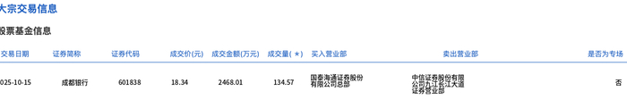 成都银行今日大宗交易平价成交134.57万股,成交额2468.01万元