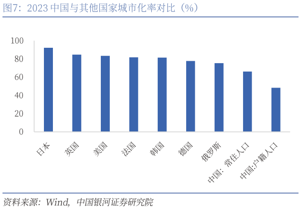 对比世界主要发达国家,我国城镇化率还有较大提升空间。随着乡城人口迁移政策的逐渐放开,我国的城镇化率得到大幅提升,常住人口城镇化率常住人口城镇化率由1978年的17.9%快速增长到2023年的66.16%,户籍人口城镇化率由2016年的41.2%增长到2023年的48.3%,累计增长了7.1个百分点。但由于我国城市地区的落户门槛限制,以及户籍身份和公共服务、子女教育、医疗、社保的绑定,使得大量的外出农民工无法在城市落户。我国的城镇化率尤其是户籍人口城镇化率和其他国家相比存在较大差距。以户籍人口城镇化率为例,我国户籍人口城镇化率比日本低了43.7个百分点,比美国低了35个百分点。此外,还需要关注的是近年来我国常住人口城镇化率和户籍人口城镇化率之间的差距呈进一步扩大趋势,彰显了深化户籍制度改革的必要性。