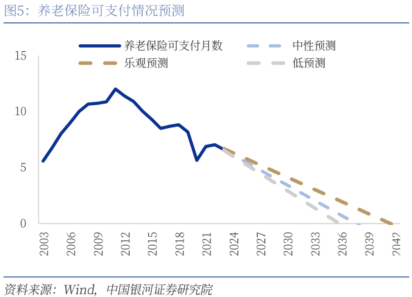 老龄化也带来了社会保险支出的可持续性问题。目前我国运行的社保体系有三套针对不同人群的官方养老保险系统,分别是企业职工基本养老保险、城乡居民养老保险以及城镇职工基本养老保险,因此我们在后续计算养老保险收入和支出时会按三者总额计算。截止2022年,企业养老保险,城乡养老保险以及城镇养老保险分别收入47932亿元、5609亿元以及63323.8亿元,总计116865.96亿元;支出分别为43661亿元、4044.28亿元以及59030亿元,总计支出106736.51亿元。虽然收入大于支出,2022年养老保险盈余9265.67亿元,但其中财政补贴在2022年达到9992.57亿元,因此如扣除财政补贴,则盈余缺口为-726.86亿元。剔除财政补贴的收支缺口连续4年为负。我们根据三大养老保险年末结余和支出情况计算了目前养老保险可支付情况,截止2022年养老保险可支付月数为7个月左右(即如果养老保险收入突然中断后,结余的养老保险可继续支付的月数)。我们分别作出了乐观预测、中性预测和低预测:如果按照现行体制,在没有财政补贴的情况下,养老保险最快于2036年出现收支不平的问题,最晚于2040年。此外,通过计算各省的养老保险收支缺口我们发现,老龄化越严重的省份,养老保险赤字越严重。因此,这也是本次渐进式延迟退休实施的客观原因。