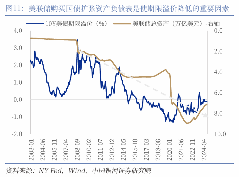 ·无需过虑美债收益率持续回升的第一个理由: 4.0%-4.5%的自然利率与通胀预期,再叠加正向期限溢价的预期范围,似乎已经过早定价了财政扩张以及通胀中枢的明显回升。(1)自然利率属于概念性数值,纽约联储测算的大致的范围在0.7%至1.3%之间,1.5%或者更高的自然利率假定了更强的中长期通胀和增长中枢,但这目前并无特别坚挺的证据支撑。美联储9月经济展望中对中性利率的评估约在3%左右,这对应着2%通胀目标达成下1%左右的自然利率水平。(2)期限溢价方面,自金融危后量化宽松实施以来,期限溢价虽有波动,但整体呈现回落的状态,这本质上反映了市场在美联储扩表干预金融市场后,对美债安全性的信心增加。同时,全球金融危机以来的总债务增长斜率的上行并未影响期限溢价的降低。鉴于美国货币政策配合财政的大背景,美联储资产负债表跟随经济和赤字继续扩张才是常态,在多次危机中美联储也展现了必要时坚定扩表吸收国债的决心,在这一核心逻辑并未变化的情况下,期限溢价在中长期回升的空间也有限。10年期国债收益率近期的合理范围仍在约1.3%的自然利率+2.5%左右的核心通胀+0%-0.5%的期限溢价之间,也即3.7%-4.3%左右,而目前的市场定价已经较为充分。
