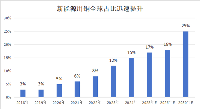 过去几年新能源汽车、光伏、风电等高速增长,该领域铜需求占比已从2018年的3%增长至2023年的12%,2025年有望进一步增长至17%。