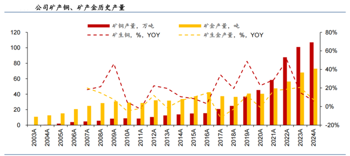 2019-2024年,紫金矿业的矿产铜产量从37万吨增长至107万吨,年复合增速24%,是全球范围内为数不多可以具备两位数增长的头部铜矿企业;矿产金产量从41吨增长至73吨,年复合增速12%。