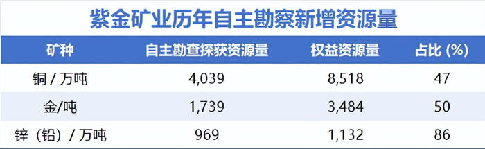 截至2024年末,紫金矿业自主勘探铜4039万吨,金1739吨。