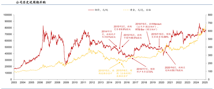 公司在金、铜价格相对低迷的时候布局优质矿产资源,以相对合理的成本完成了多笔战略性并购。
