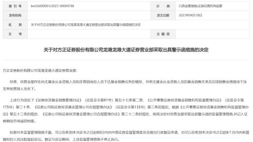 今年4月,浙江证监局点名方正证券龙港龙港大道营业部在基金销售方面的乱象,时任营业部负责人林晓锋因负有直接责任,收到监管警示函,并且记入诚信档案。而无证执业的员工罗小玲女士,同样也被监管警示,记入档案。