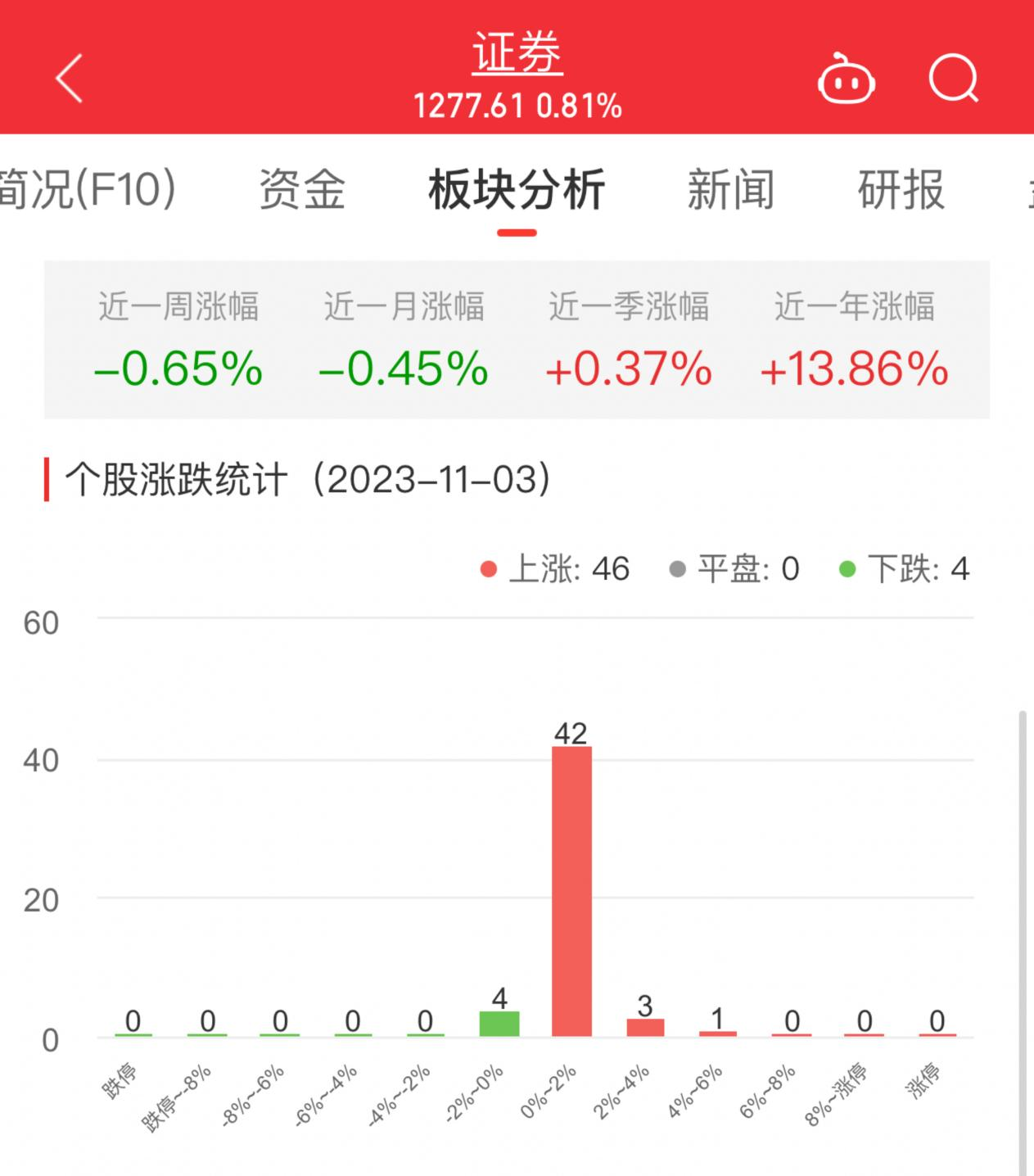 中国经济网北京11月3日讯 今日,证券板块整体涨幅0.81%,其中46只股票上涨,4只股票下跌。