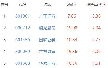 其中,方正证券、锦龙股份、国联证券、东方财富、华泰证券位列板块涨幅前五位,涨幅分别为5.36%、2.94%、2.75%、2.06%、1.61%。
