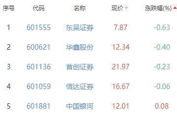 东吴证券、华鑫股份、首创证券、信达证券、中国银河位列涨幅榜后五位,涨幅分别为-0.63%、-0.40%、-0.23%、-0.06%、0.08%。