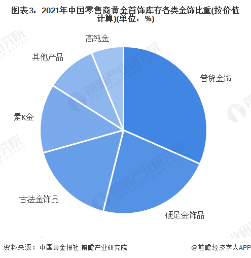从细分产品来看,根据统计,2021年黄金零售商库存中各类金饰中,铺货金饰占比仍为最高,超过30%,其次为硬足金产品和古法金产品。其中古法金饰品近年来较为受欢迎,2020年其在黄金饰品类仅排第四,2021年则排名第三。
